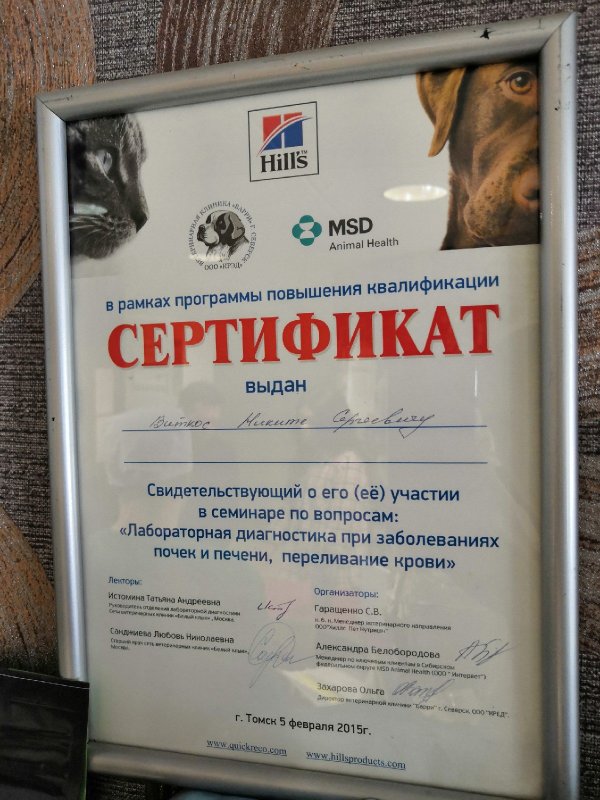Хочу выразить огромную благодарность Никите Сергеевичу Виткос! Мы отказались от операции, которую настоятельно рекомендовали в другой клинике. Благодаря рекомендациям Никиты Сергеевича наша собака сейчас здоровая и счастливая) Спасибо огромное, что он дал нам надежду!